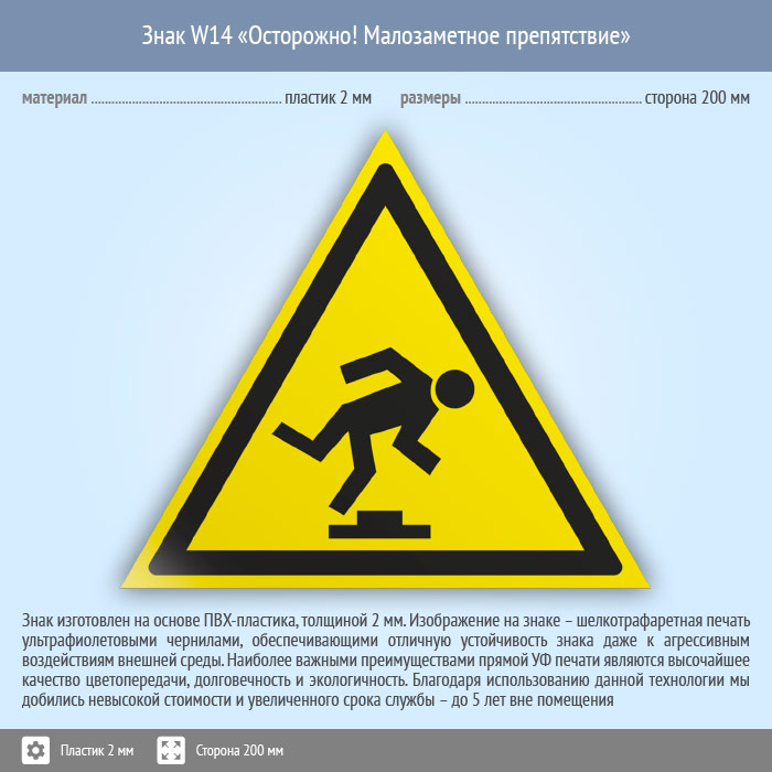 Знак W14 «Осторожно! малозаметное препятствие» (пластик, сторона 200 мм) в Магнитогорске купить