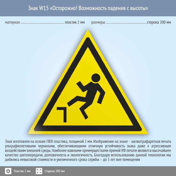 Знак W15 «Осторожно! возможность падения с высоты» (пластик, сторона 200 мм) в Магнитогорске купить