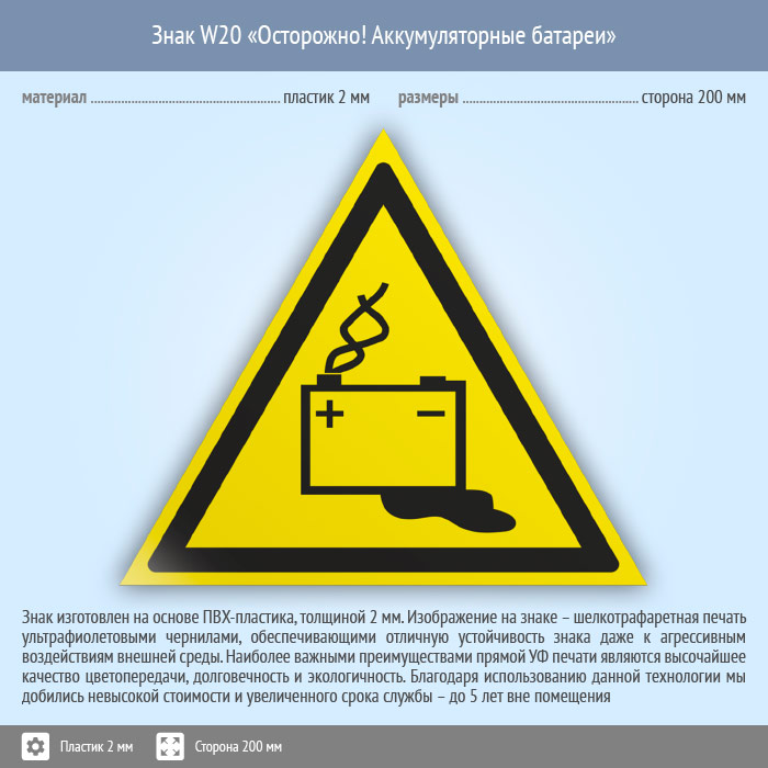 Знак W20 «Осторожно! аккумуляторные батареи» (пластик, сторона 200 мм) в Магнитогорске купить