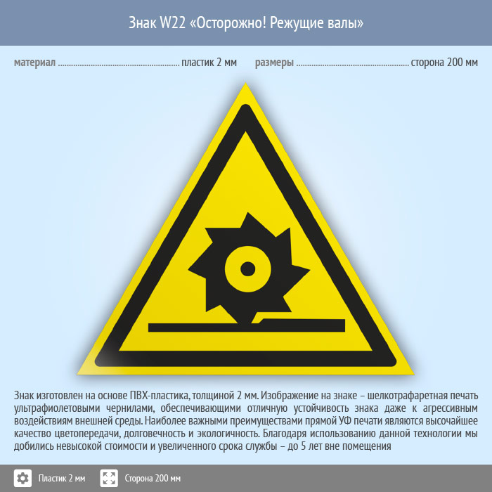 Знак W22 «Осторожно! режущие валы» (пластик, сторона 200 мм) в Магнитогорске купить
