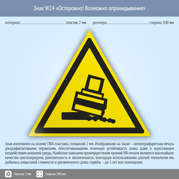 Знак W24 «Осторожно! возможно опрокидывание» (пластик, сторона 200 мм) в Магнитогорске купить