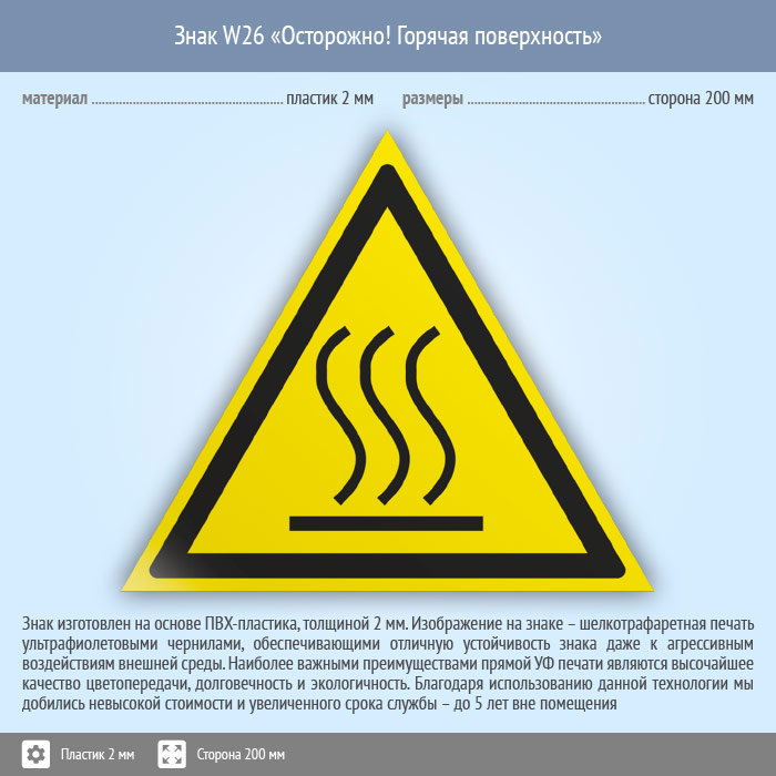 Знак W26 «Осторожно! горячая поверхность» (пластик, сторона 200 мм) в Магнитогорске купить