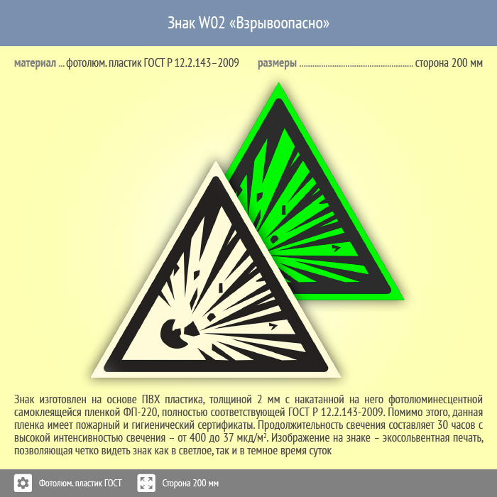 Знак W02 «Взрывоопасно» (фотолюминесцентный пластик ГОСТ 34428-2018, сторона 200 мм) в Магнитогорске купить