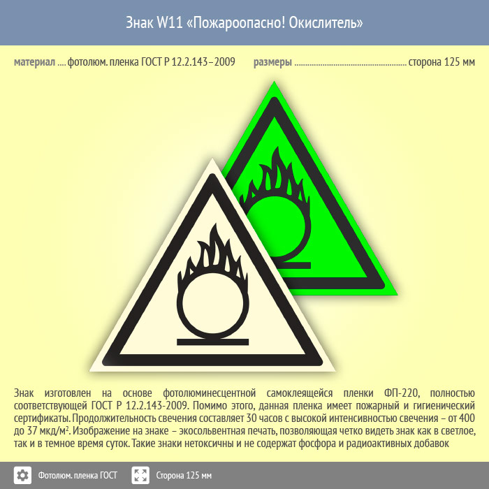 Знак W11 «Пожароопасно! окислитель» (фотолюминесцентная пленка ГОСТ 34428-2018, сторона 125 мм) в Магнитогорске купить