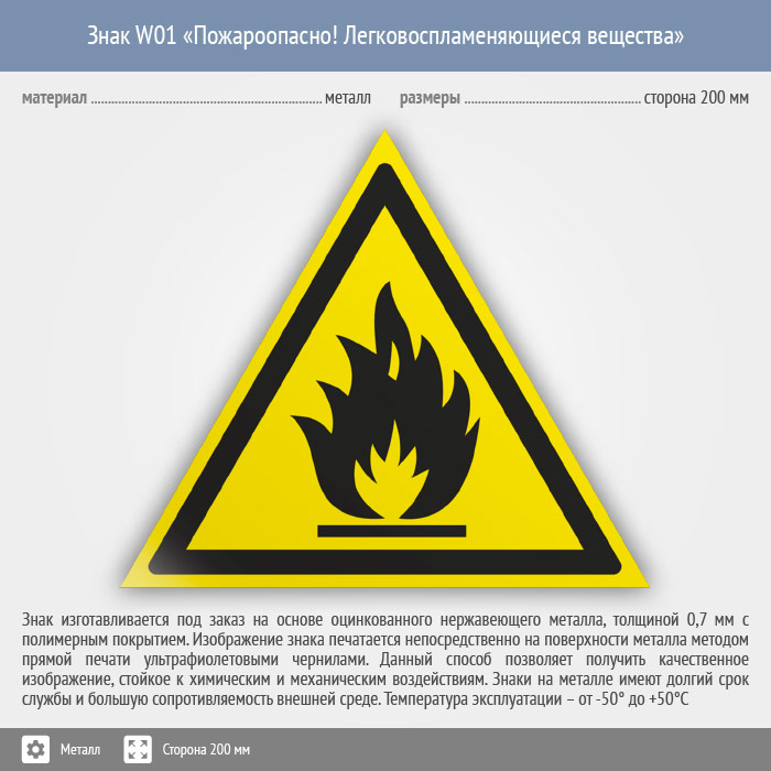 Знак W01 «Пожароопасно! легковоспламеняющиеся вещества» (металл, сторона 200 мм) в Магнитогорске купить
