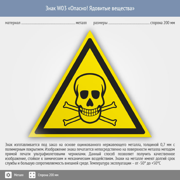 Знак W03 «Опасно! ядовитые вещества» (металл, сторона 200 мм) в Магнитогорске купить