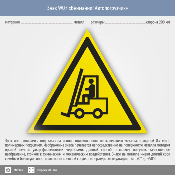 Знак W07 «Внимание! автопогрузчик» (металл, сторона 200 мм) в Магнитогорске купить