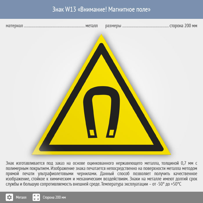 Знак W13 «Внимание! магнитное поле» (металл, сторона 200 мм) в Магнитогорске купить