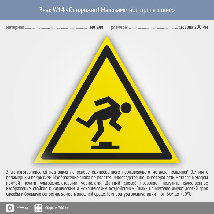 Знак W14 «Осторожно! малозаметное препятствие» (металл, сторона 200 мм) в Магнитогорске купить