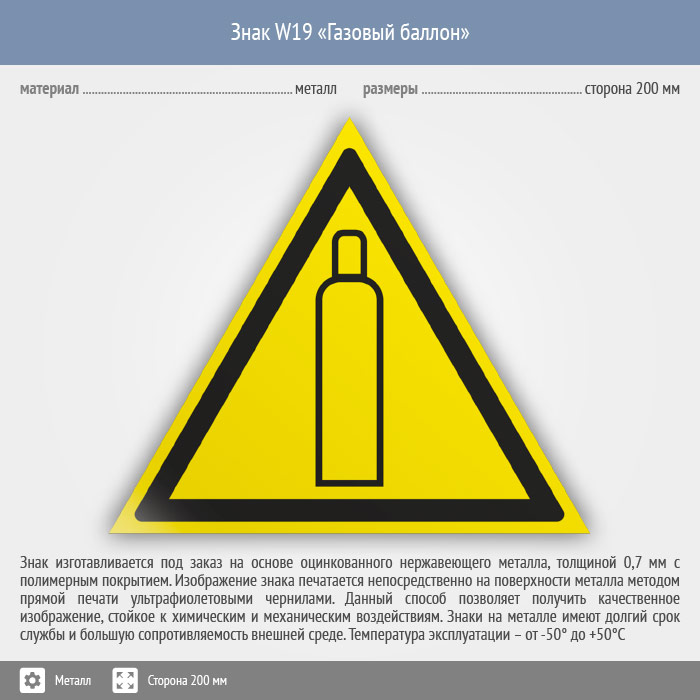 Знак W19 «Газовый баллон» (металл, сторона 200 мм) в Магнитогорске купить