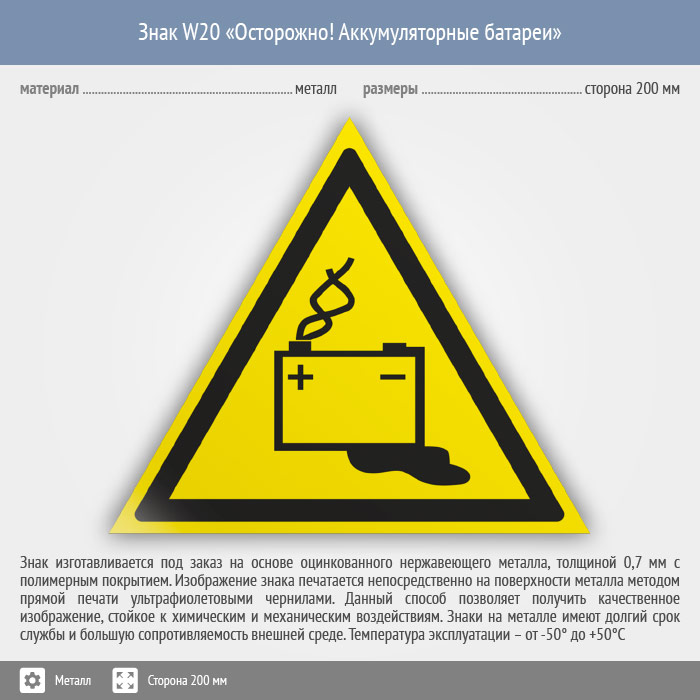 Знак W20 «Осторожно! аккумуляторные батареи» (металл, сторона 200 мм) в Магнитогорске купить