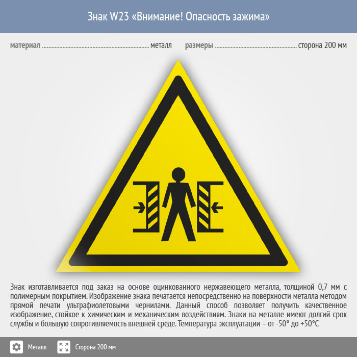 Знак W23 «Внимание! опасность зажима» (металл, сторона 200 мм) в Магнитогорске купить