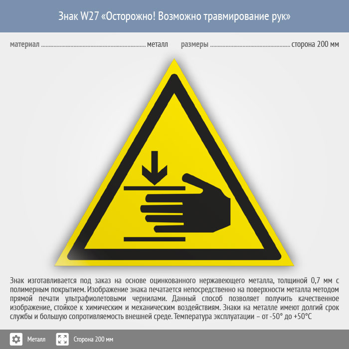 Знак W27 «Осторожно! возможно травмирование рук» (металл, сторона 200 мм) в Магнитогорске купить