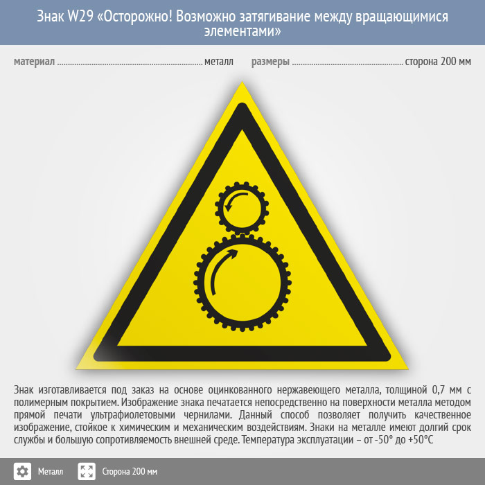 Знак W29 «Осторожно! возможно затягивание между вращающимися элементами» (металл, сторона 200 мм) в Магнитогорске купить