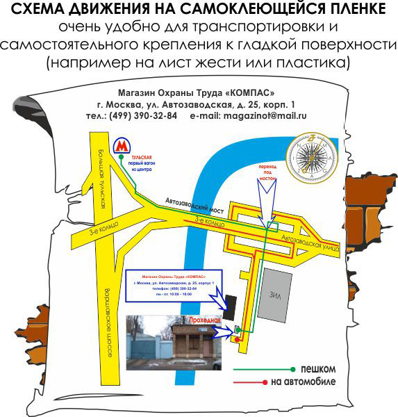 В данной товарной группе предствлены схемы движения автотранспорта, изготовленные на самоклеящейся ПВХ-плёнке.Такую схему при небольшом навыке нетрудно приклеить на гладкую подготовленную поверхность. Пленка предназначена для использования на улице: не боится света и воды. Полимерные самоклеящиеся пленки превосходят другие материалы по адгезии и морозоустойчивости, поэтому схемы изготовленные с их применением, долго сохраняют свой внешний вид. В цену схемы включены: разработка и согласование макета, изготовление и упаковка