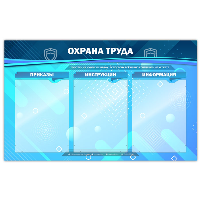 Стенд «Охрана труда» состоит из 3-х плоских карманов А4 формата книжной ориентации со следующими рубриками: приказы, инструкции, информация…