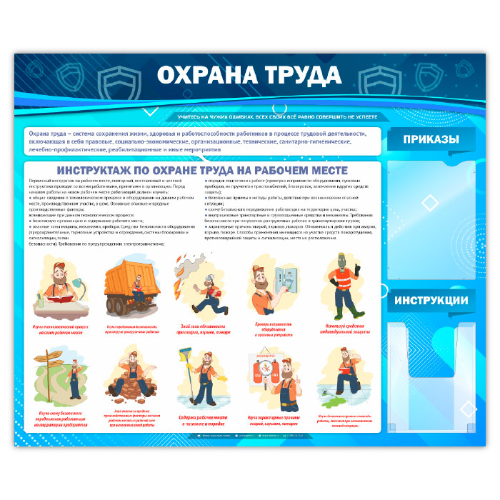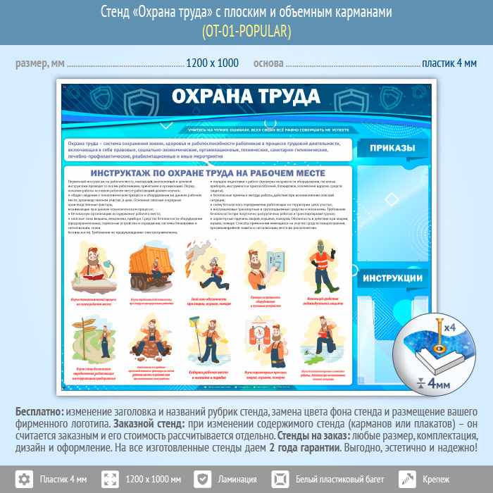 Стенд «Охрана труда» – это, прежде всего, содержательный и качественно проиллюстрированный первичный инструктаж на рабочем месте и два кармана: плоский А4 формата – для приказов и объемный карман А4 формата – для инструкций…