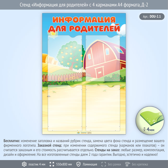 Стенд «Информация для родителей» с 4 карманами А4 формата (DOU-2.1) в Магнитогорске купить