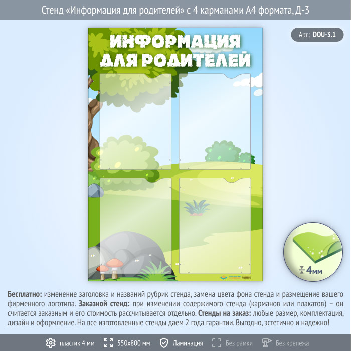 Стенд «Информация для родителей» с 4 карманами А4 формата (DOU-3.1) в Магнитогорске купить