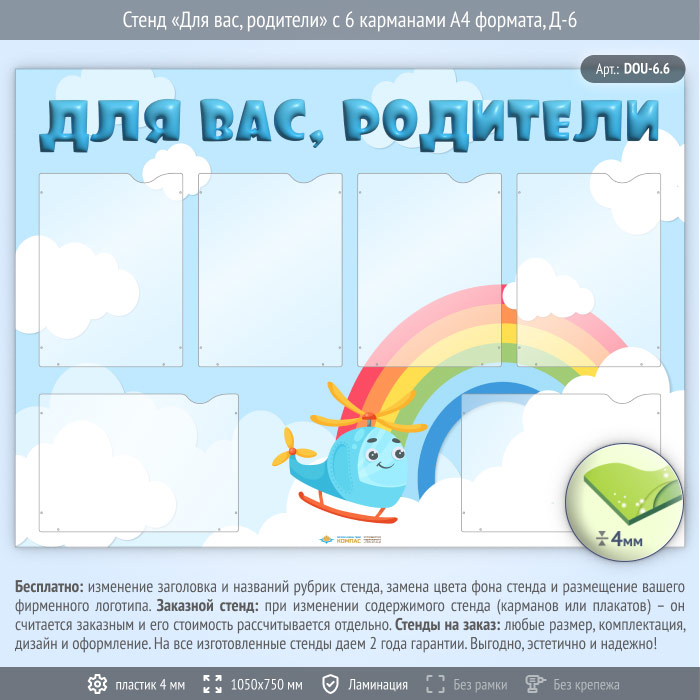 Стенд «Для вас, родители» с 6 карманами А4 формата (DOU-6.6) в Магнитогорске купить