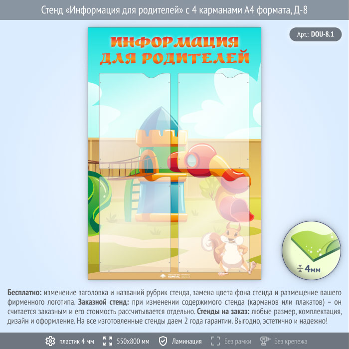 Стенд «Информация для родителей» с 4 карманами А4 формата (DOU-8.1) в Магнитогорске купить