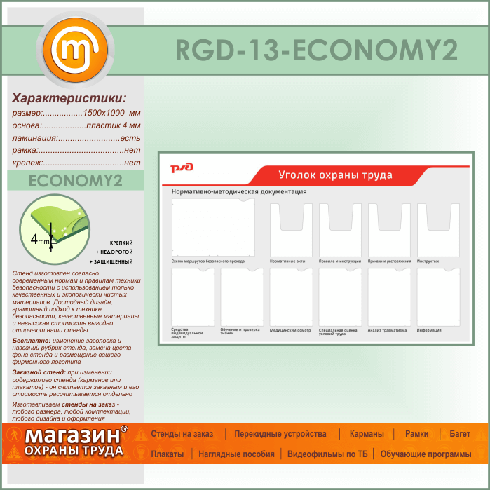 Стенд «Уголок охраны труда» с 1 плоским карманом А3 формата, 6 плоскими и 4 объемными карманами А4 формата (RGD-13-ECONOMY2) в Магнитогорске купить