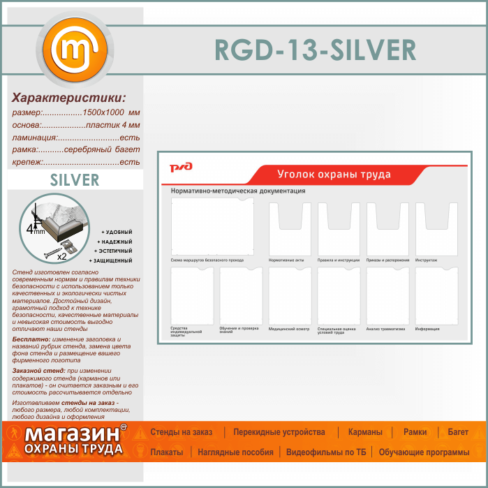 Стенд «Уголок охраны труда» с 1 плоским карманом А3 формата, 6 плоскими и 4 объемными карманами А4 формата (RGD-13-SILVER) в Магнитогорске купить