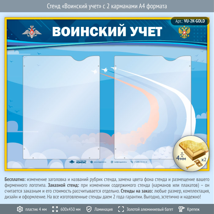 Стенд «Воинский учет» с 2 карманами А4 формата (VU-2K-GOLD) в Магнитогорске купить
