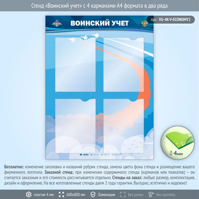 Стенд «Воинский учет» с 4 карманами А4 формата в два ряда (VU-4K-V-ECONOMY2) в Магнитогорске купить