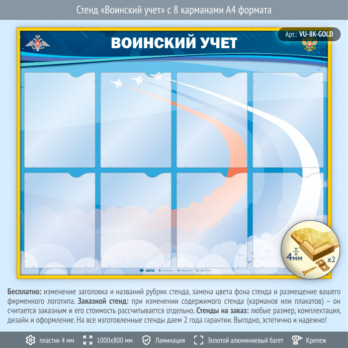 Стенд «Воинский учет» с 8 карманами А4 формата (VU-8K-GOLD) в Магнитогорске купить