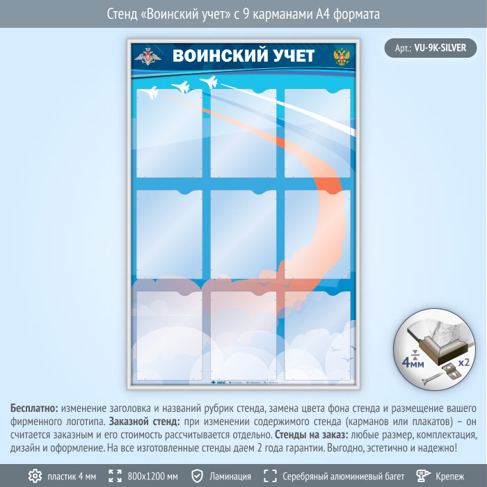 Стенд «Воинский учет» с 9 карманами А4 формата (VU-9K-SILVER) в Магнитогорске купить