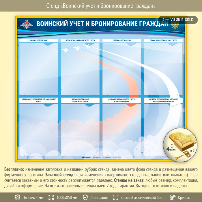 Стенд «Воинский учет и бронирование граждан» с 8 карманами А4 формата (VU-8K-R-GOLD) в Магнитогорске купить