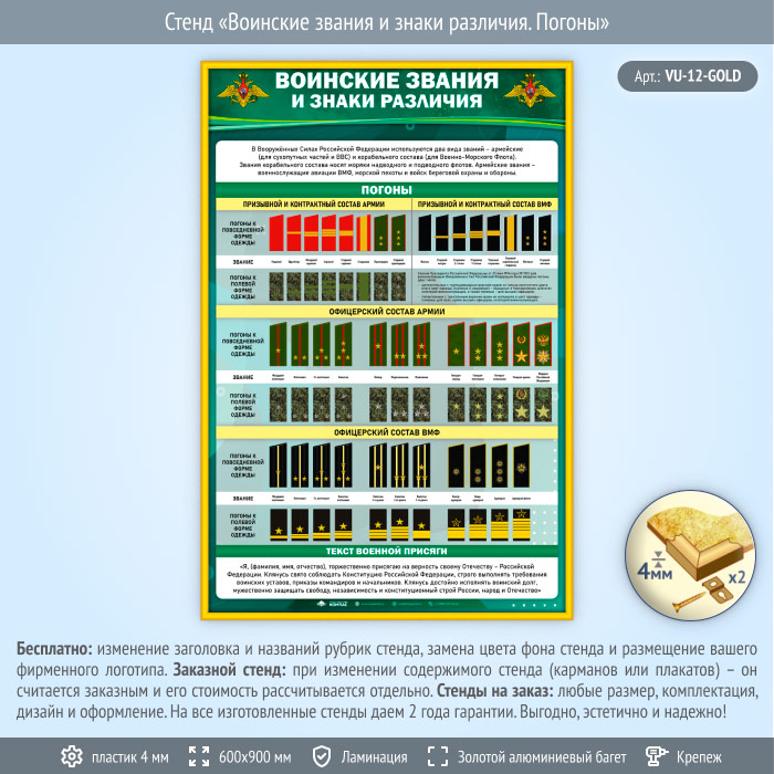 Стенд «Воинские звания и знаки различия. Погоны» (VU-12-GOLD) в Магнитогорске купить
