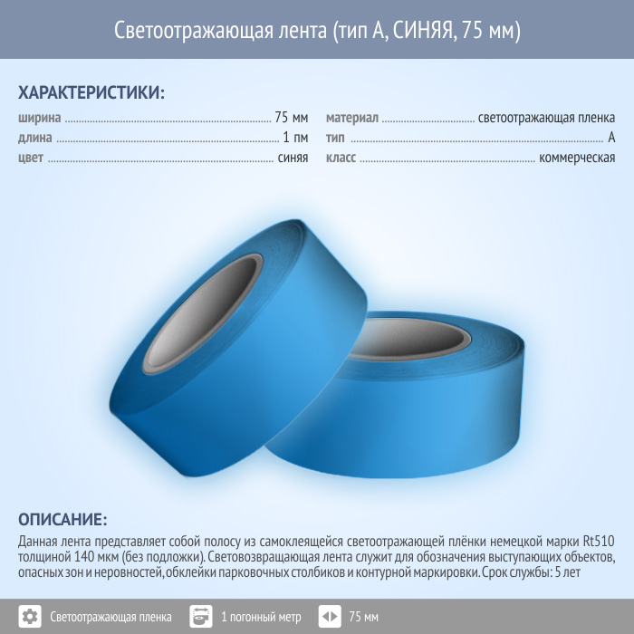 Светоотражающая однородная лента (тип А, СИНЯЯ, 75 мм х 1 п.м.) в Магнитогорске купить