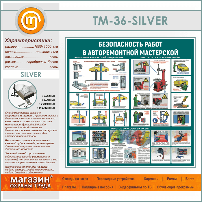 Стенд «Безопасность работ в авторемонтной мастерской» (TM-36-SILVER) в Магнитогорске купить