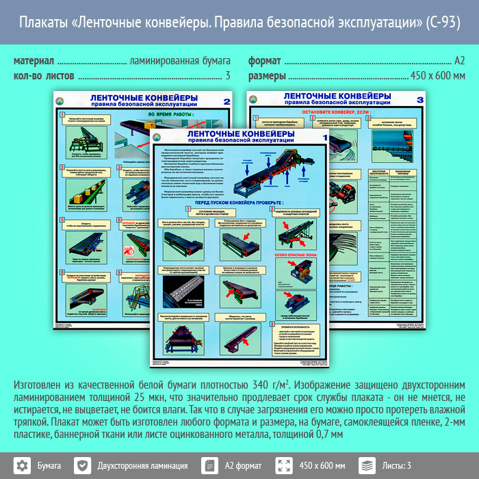 Плакаты «Ленточные конвейеры. Правила безопасной эксплуатации» (С-93, ламинированная бумага, А2, 3 листа) в Магнитогорске купить