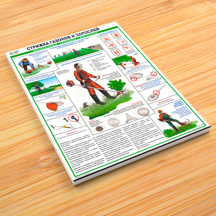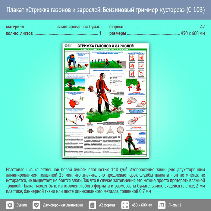 Плакат «Стрижка газонов и зарослей. Бензиновый триммер-кусторез» (С-103, ламинированная бумага, А2, 1 лист) в Магнитогорске купить