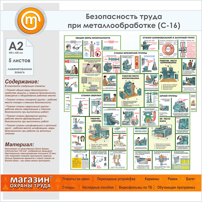 Плакат «Безопасность работ на металлообрабатывающих станках» (С-16, ламинированная бумага, А2, 5 листов) в Магнитогорске купить