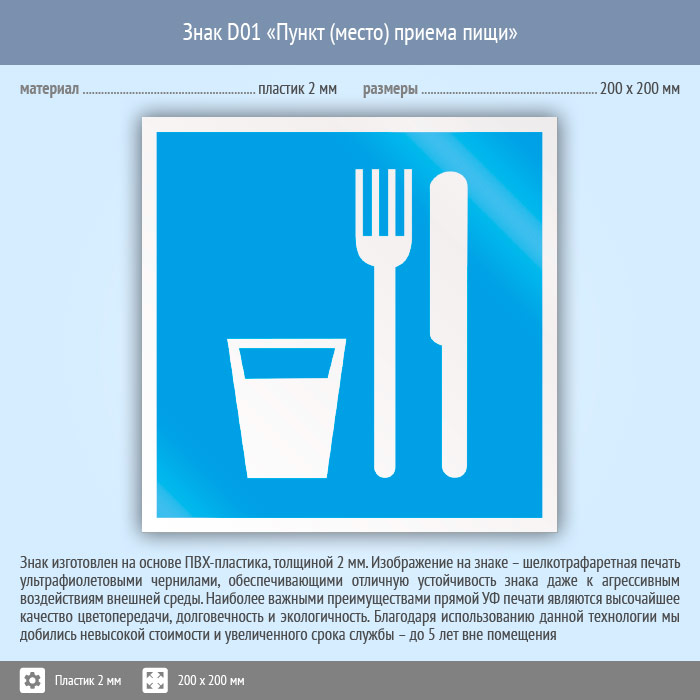 Знак D01 «Пункт (место) приема пищи» (пластик, 200х200 мм) в Магнитогорске купить