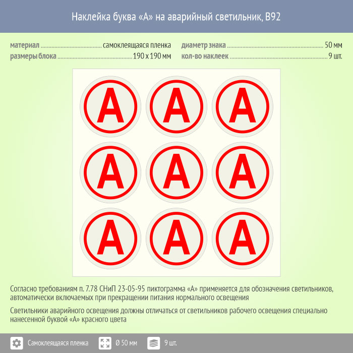Наклейка буква «А» на аварийный светильник, B92 (пленка, диаметр 50 мм, блок 9 штук, 190х190 мм) в Магнитогорске купить