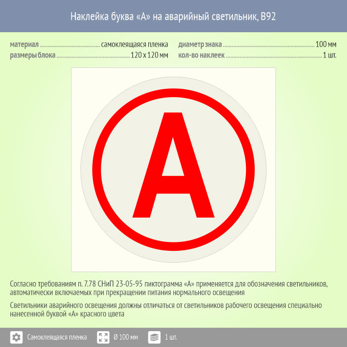 Наклейка буква «А» на аварийный светильник, B92 (пленка, диаметр 100 мм, 120х120 мм) в Магнитогорске купить