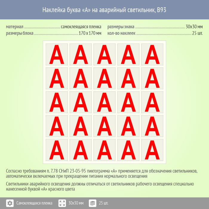 Наклейка буква «А» на аварийный светильник, B93 (пленка, 30х30 мм, блок 25 штук, 170х170 мм) в Магнитогорске купить