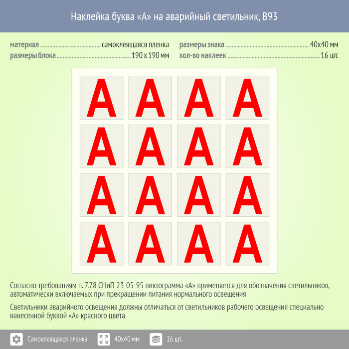 Наклейка буква «А» на аварийный светильник, B93 (пленка, 40х40 мм, блок 16 штук, 190х190 мм) в Магнитогорске купить