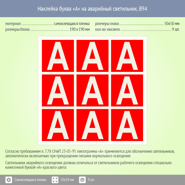 Наклейка буква «А» на аварийный светильник, B94 (пленка, 50х50 мм, блок 9 штук, 190х190 мм) в Магнитогорске купить