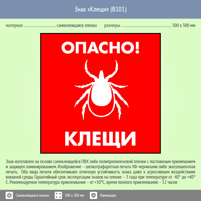 Знак «Опасно! Клещи», B101 (пленка c ламинированием, 300х300 мм) в Магнитогорске купить