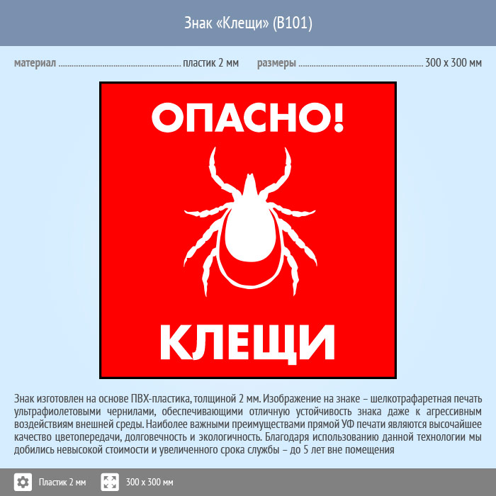 Знак «Опасно! Клещи», B101 (пластик, 300х300 мм) в Магнитогорске купить