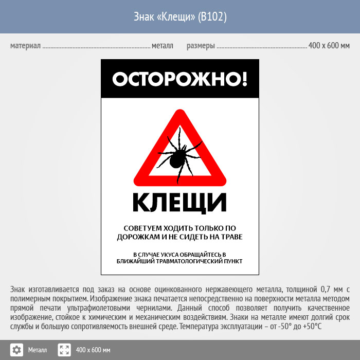 Знак «Осторожно! Клещи», B102 (металл, 300х400 мм) в Магнитогорске купить