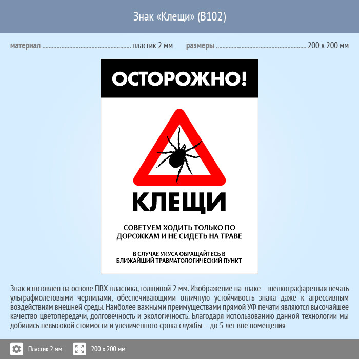 Знак «Осторожно! Клещи», B102 (пластик, 400х600 мм) в Магнитогорске купить