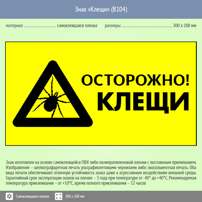 Знак «Осторожно! Клещи», B104 (пленка, 400х300 мм) в Магнитогорске купить