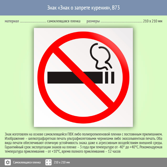 Знак «Знак о запрете курения», B73 (пленка, 210х210 мм) в Магнитогорске купить